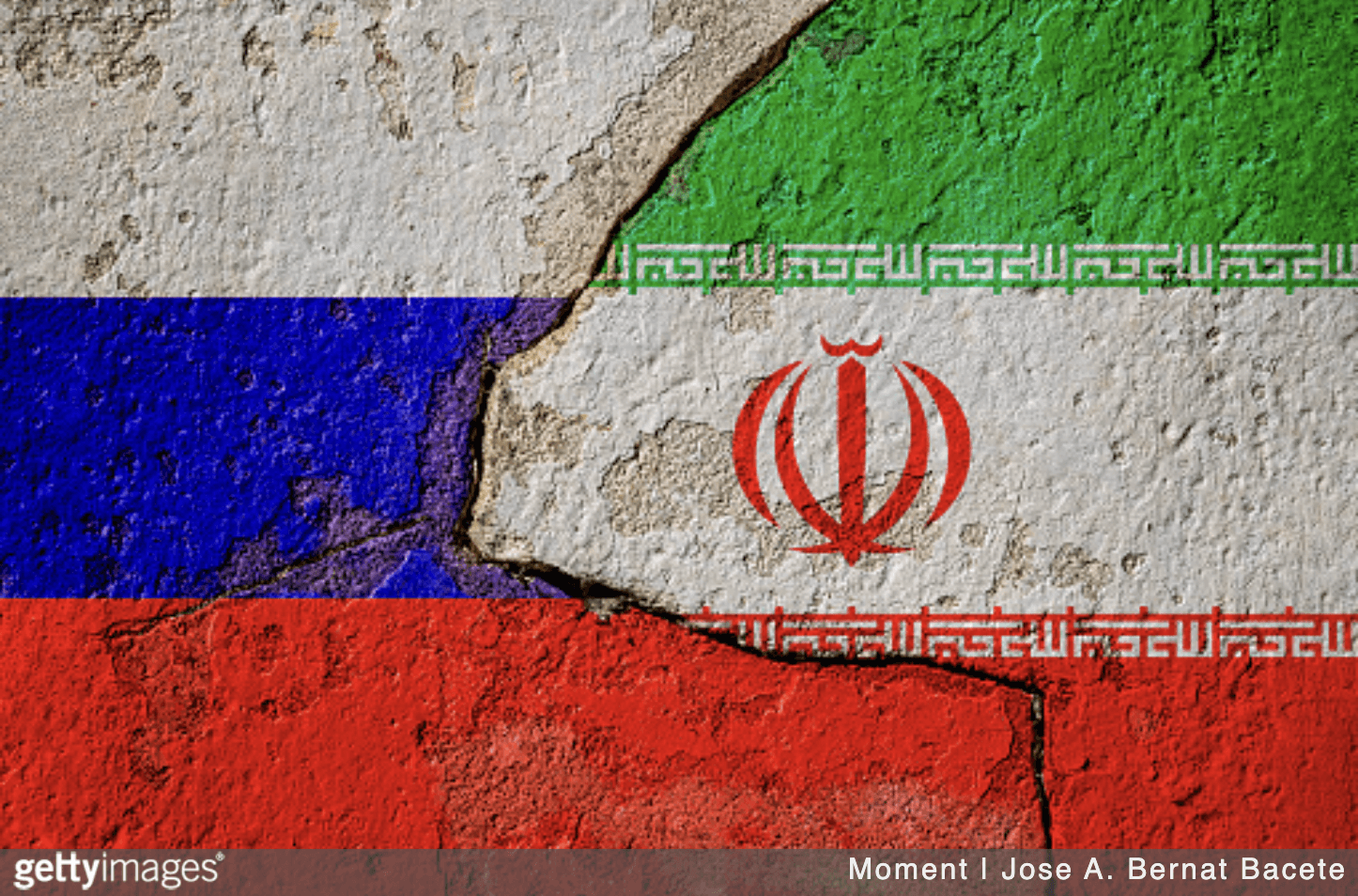 Bacete, Jose A. Bernat, 2025, Russian and Iranian flags painted on an old wall, divided by a deep crack. - stock photo, Getty Images. https://www.gettyimages.com/detail/photo/russian-and-iranian-flags-painted-on-an-old-wall-royalty-free-image/2231440917.